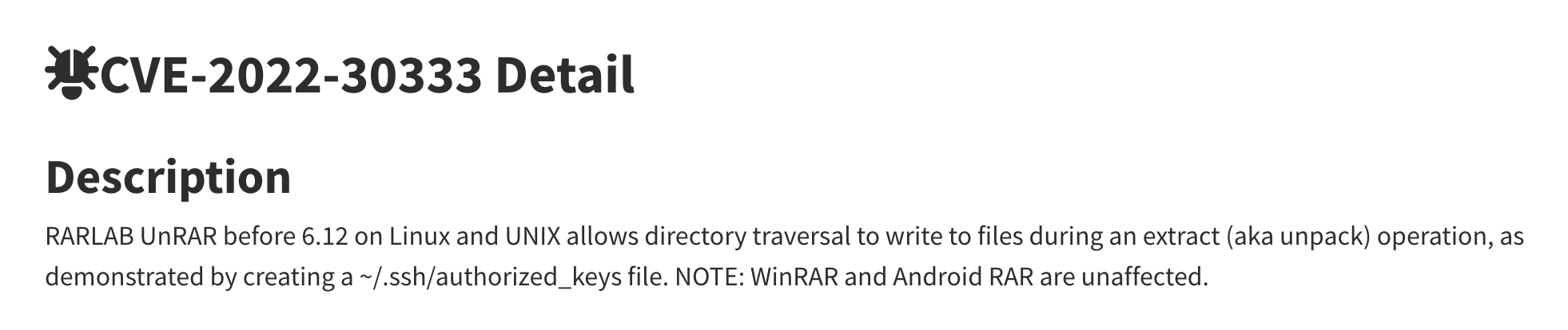 CVE-2022-30333 취약점의 개요인 "압축 해제 작업 중 일어나는 공격" 이라는 포인트를 확인할 수 있습니다.